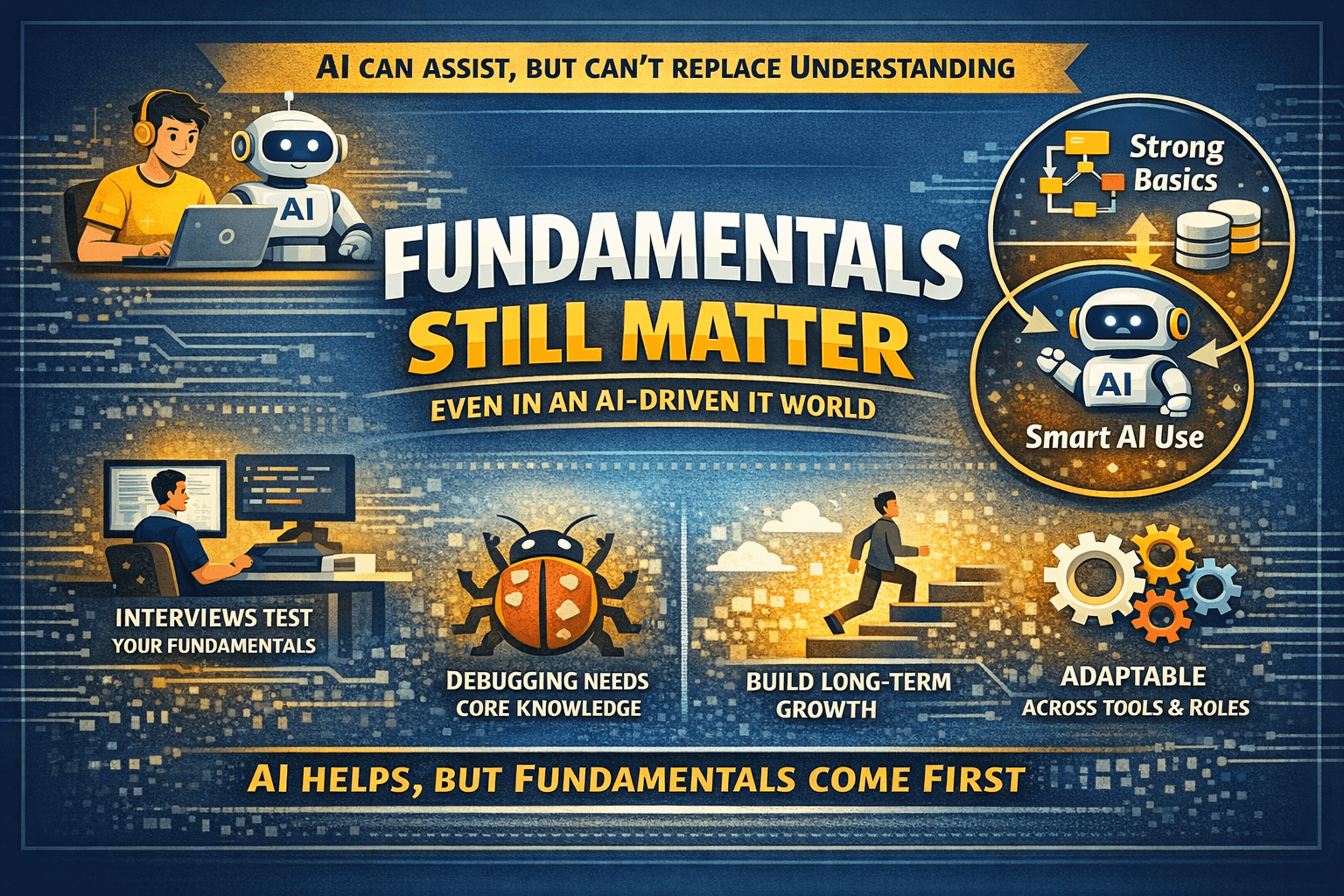 AI tools have become a regular part of the IT workplace. Freshers today use AI for writing code, fixing errors, generating test cases, and even understanding new concepts. This has created a common question among IT graduates: If AI can help so much, do fundamentals still matter?